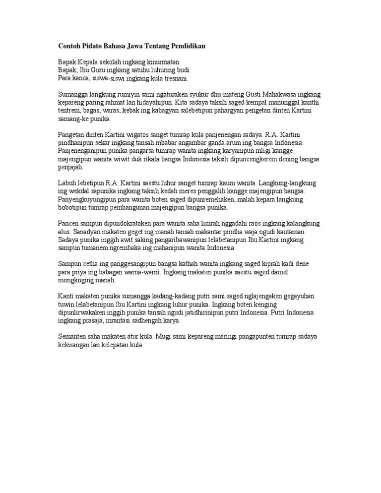Karena diperlukan materi dan latihan. Contoh pidato bahasa jawa tentang perpisahan assalamu'alaikum wr. Mulai dari perpisahan, maulid nabi, kesehatan, dan lain sebagainya. Contoh pidato bahasa berbahasa jawa ini bisa kamu gunakan untuk berbagai keperluan. Contoh pidato singkat tentang pendidikan pendidikan merupakan suatu kebutuhan pokok untuk seluruh manusia entah itu pendidikan formal .